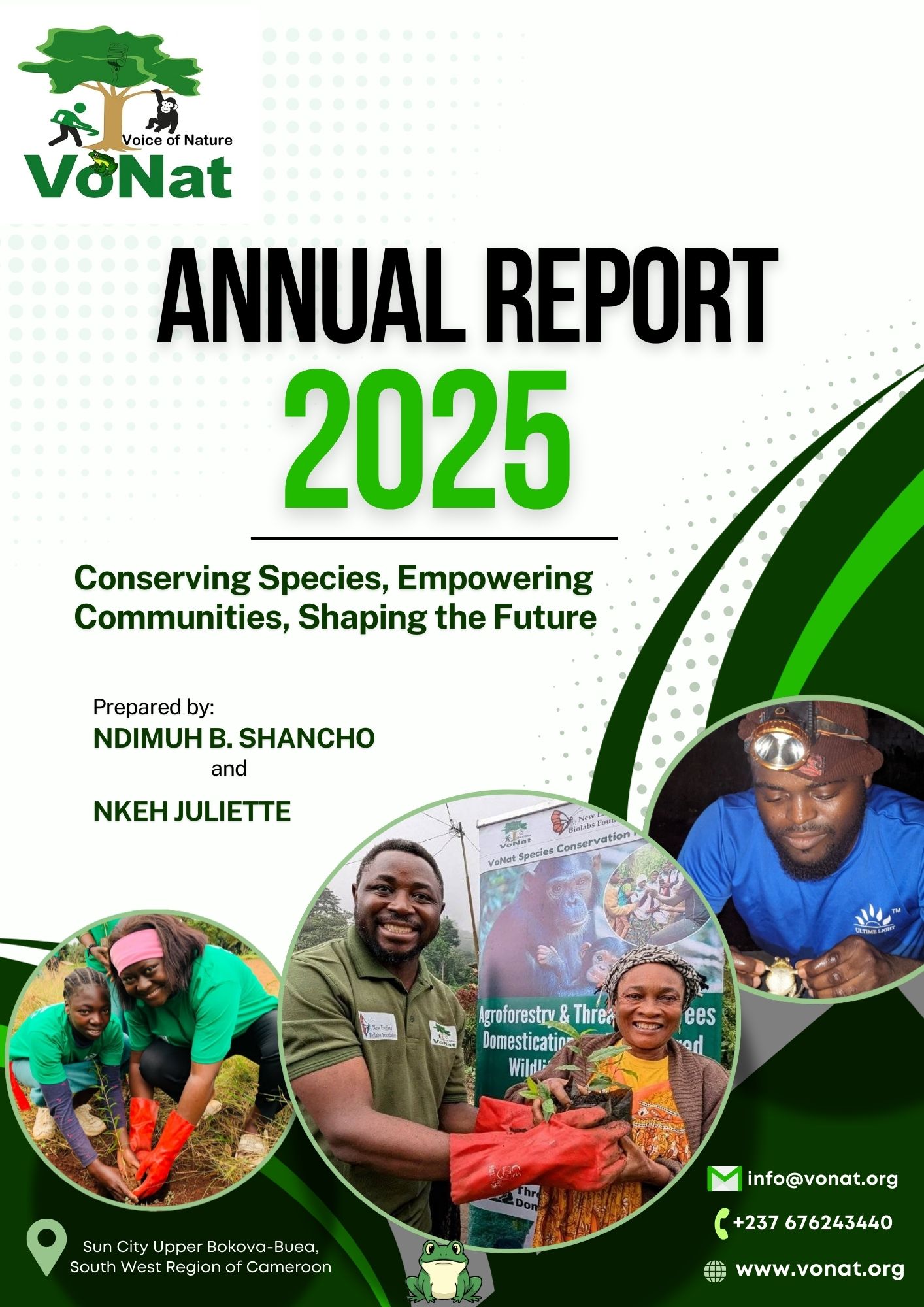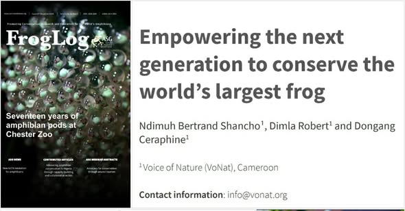 Voice of Nature (VoNat) has been featured in the December 2025 issue of FrogLog, the flagship publication of the IUCN Amphibian Specialist Group, with an article titled “Empowering the Next Generation to Conserve the World’s Largest Frog.” FrogLog is recognized worldwide as the amphibian conservation community’s leading news source, publishing research findings, conservation actions, and field stories from scientists and practitioners across the globe. The inclusion of VoNat’s work highlights growing international interest in community-driven and youth-centered amphibians conservation approaches in Cameroon. Read More