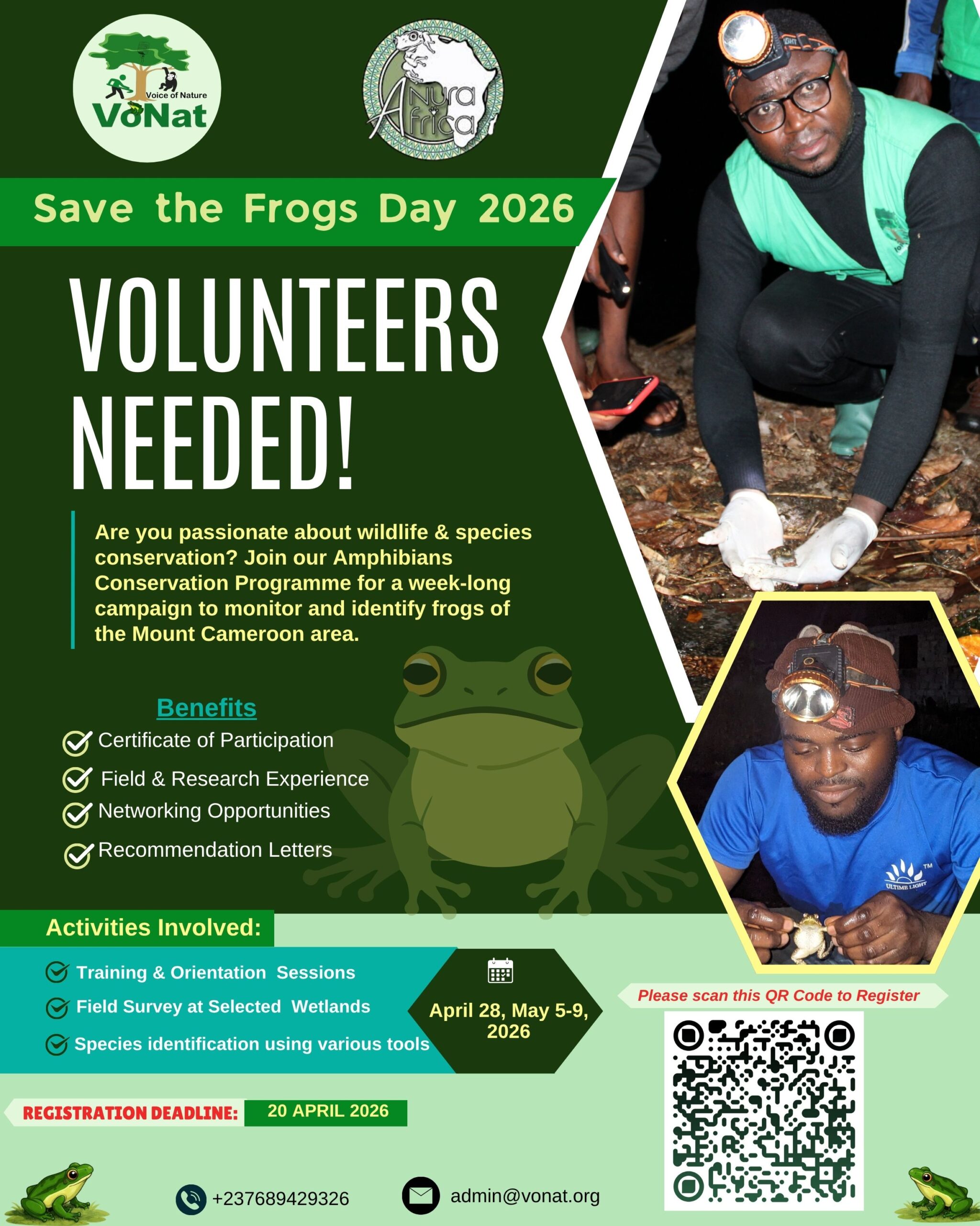 Voice of Nature (VoNat) is looking for passionate youth volunteers to join its Amphibians Conservation Program as part of Save The Frogs Day & Amphibian Week 2026 , and help expand efforts to monitor and conserve frog species in the Mount Cameroon area. Register Here