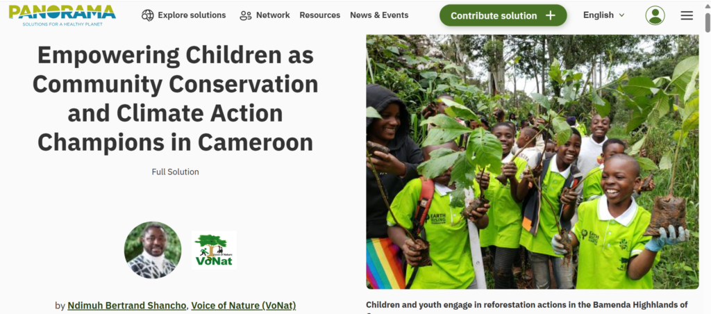 Voice of Nature (VoNat) has been featured on PANORAMA – Solutions for a Healthy Planet for its innovative program Empowering Children as Community Conservation and Climate Action Champions in Cameroon , highlighting a scalable model for inclusive conservation and climate engagement. The published solution showcases how VoNat is equipping children aged 10–18 across four regions of Cameroon with environmental knowledge, ecological skills, and leadership opportunities to become active agents of change.